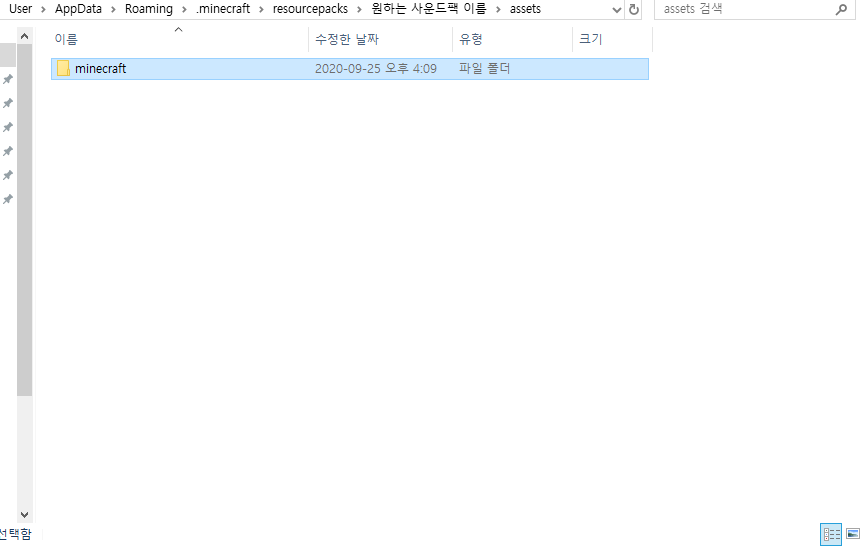 그 후 assets 폴더로 들어와서 minecraft 라는 폴더를 또 만들어주세요!