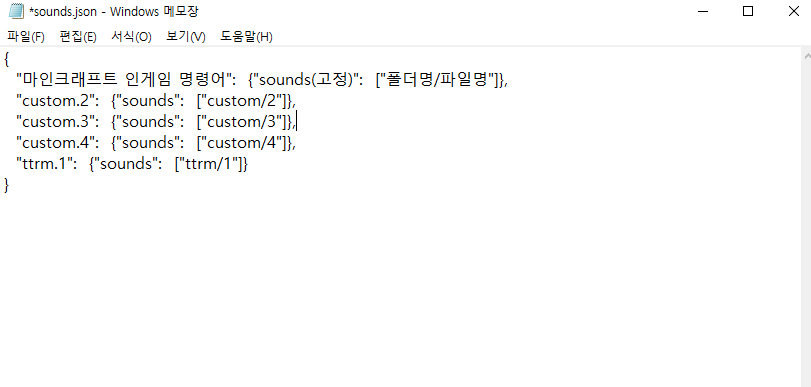 "마크 인게임에서 쓸 명령어": {"sounds(고정)": ["폴더명/파일명"]} 이 형식에 맞춰서