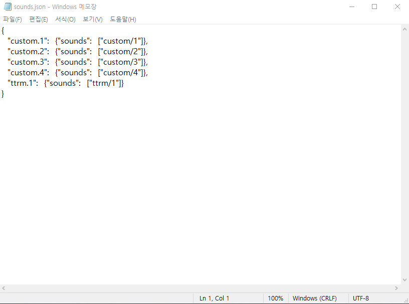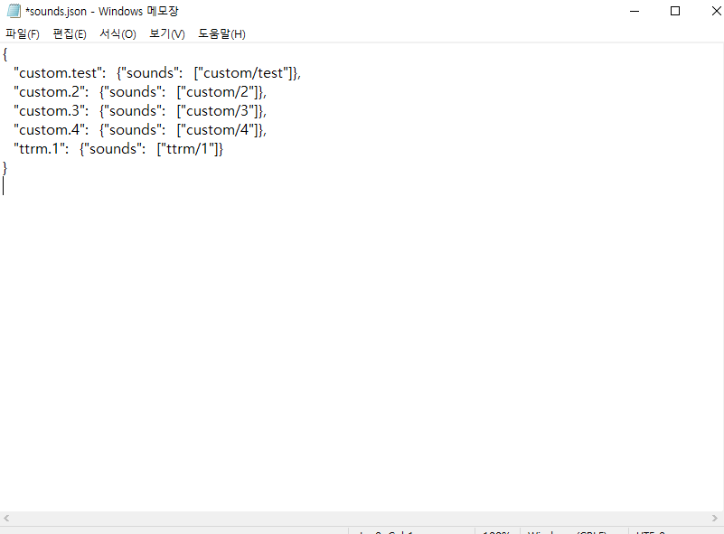 그리고 다운받고 넣어두신 sounds.json 파일을 메모장으로 열어주세요 !