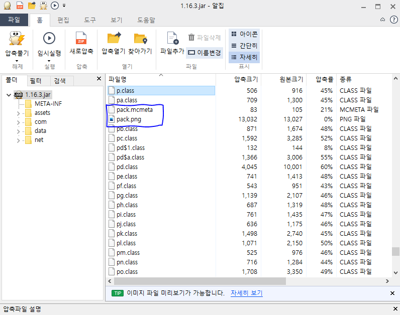 그리고 압축된 파일들 중에서 pack.mcmeta 파일과 pack.png 파일 단 두 개의 파일만 압축을 해제해주세요