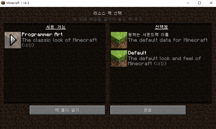 그 후 인게임 리소스 팩을 적용시켜 주신 후,