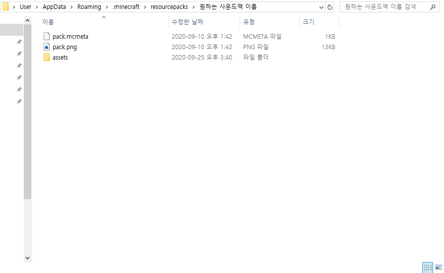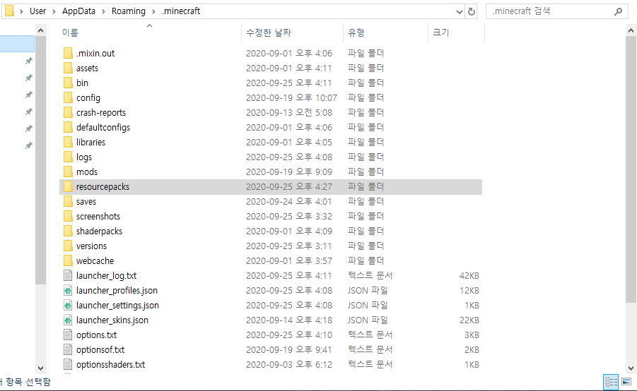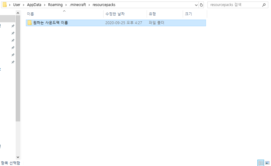 리소스 팩 폴더에 새로운 폴더를 하나 만들어주세요! (리소스 팩 이름이 될 폴더입니다)