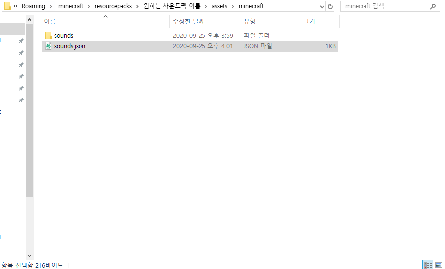 minecraft 폴더로 들어와서 이번엔 sounds 라는 폴더를 만들어 주시고 제가 올려드린 sounds.json 파일을 다운로드하여서 함께 minecraft 폴더로 넣어주세요!