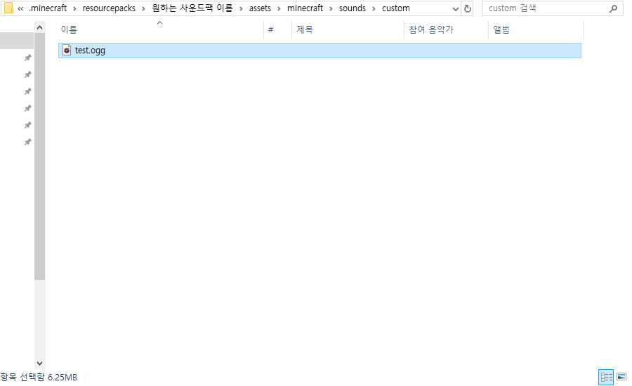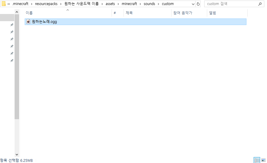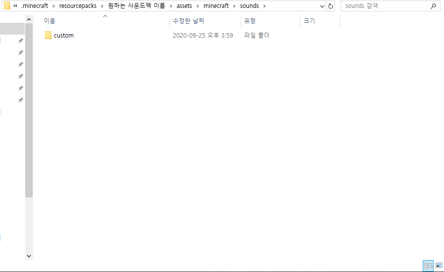 그리고 sounds 폴더로 들어와서 custom이라는 폴더를 하나 더 만들어 주세요! 이 폴더가 노래를 넣을 폴더입니다